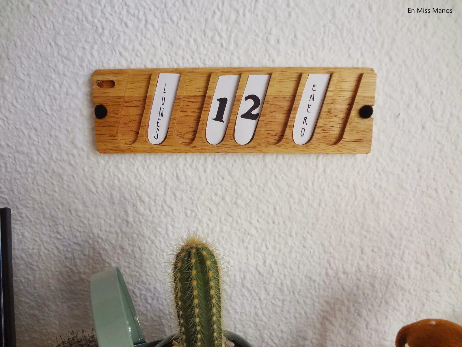 Y para terminar y tras escribir el día y el mes para colocarlo a cada lado de la fecha, coloqué un par de pompones negros en otros huecos de la madera para darle algo de vidilla.
