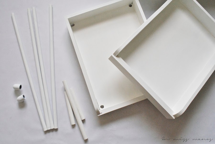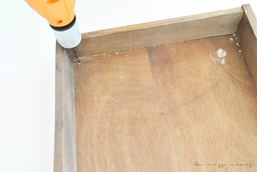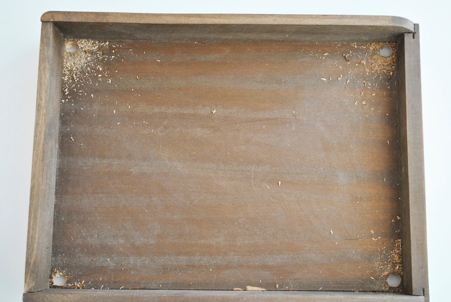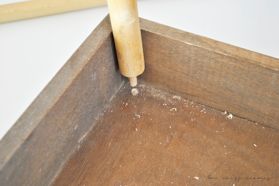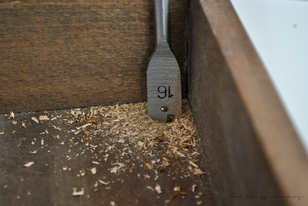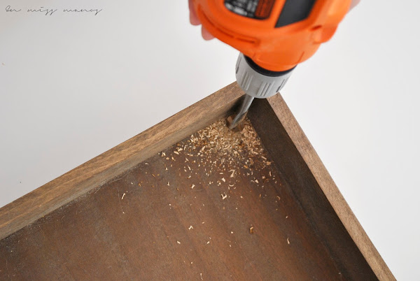 Lo primero que hice fue hacer los agujeros para pasar las varrillas por las esquinas interiores de los cajones, a modo de patas.