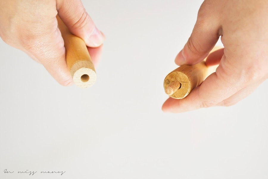 En el cajón de arriba, y en la parte donde va el asa apoyada, se hacen también los agujeros con el grosor de los tacos, ya que deben pasar por en medio para unir las patas traseras con el asa, y que así el cajón quede sujeto.