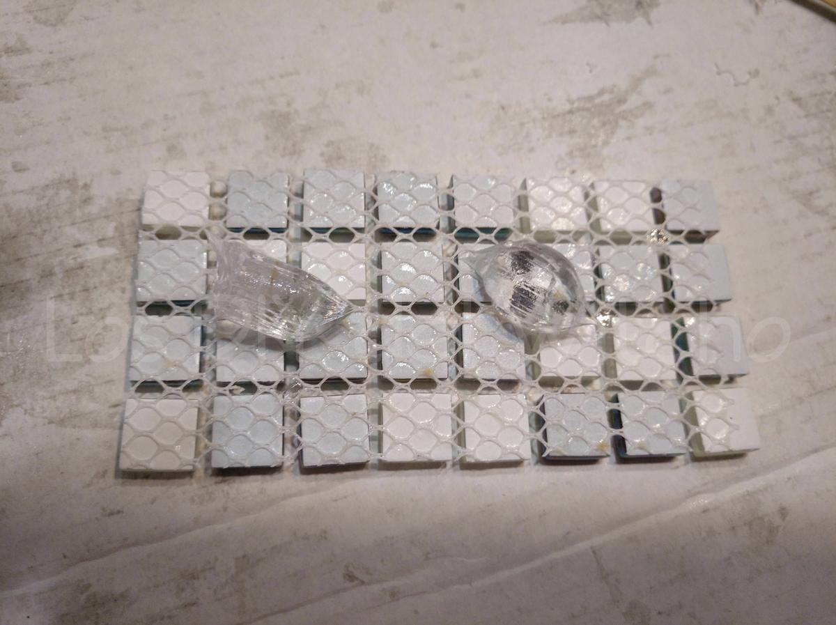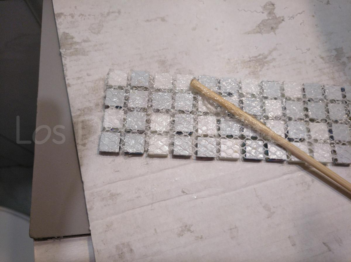 Para pegar las tiras de gresite se pueden pegar perfectamente con un adhesivo rápido, utilizaremos preferentemente uno transparente.Aplicaremos pequeñas «nueces» de cola y a continuación las extenderemos bien, ocupando toda la tira de gresite.