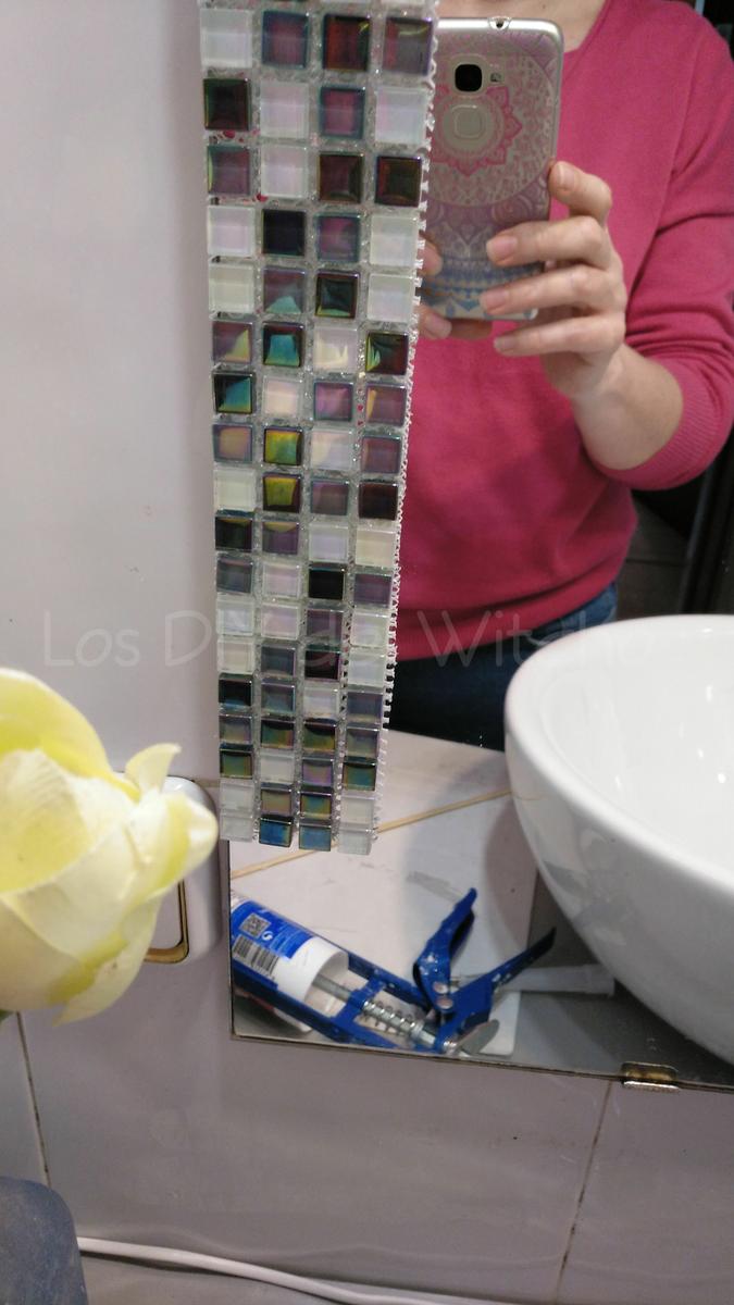 Otra de las opciones que barajé, fue la de hacer mi propio marco. La verdad es que últimamente he encontrado molduras muy interesantes que podrían quedar geniales, pero finalmente me decanté por el gresite y si además es del que brilla…pues más alegría para el baño.