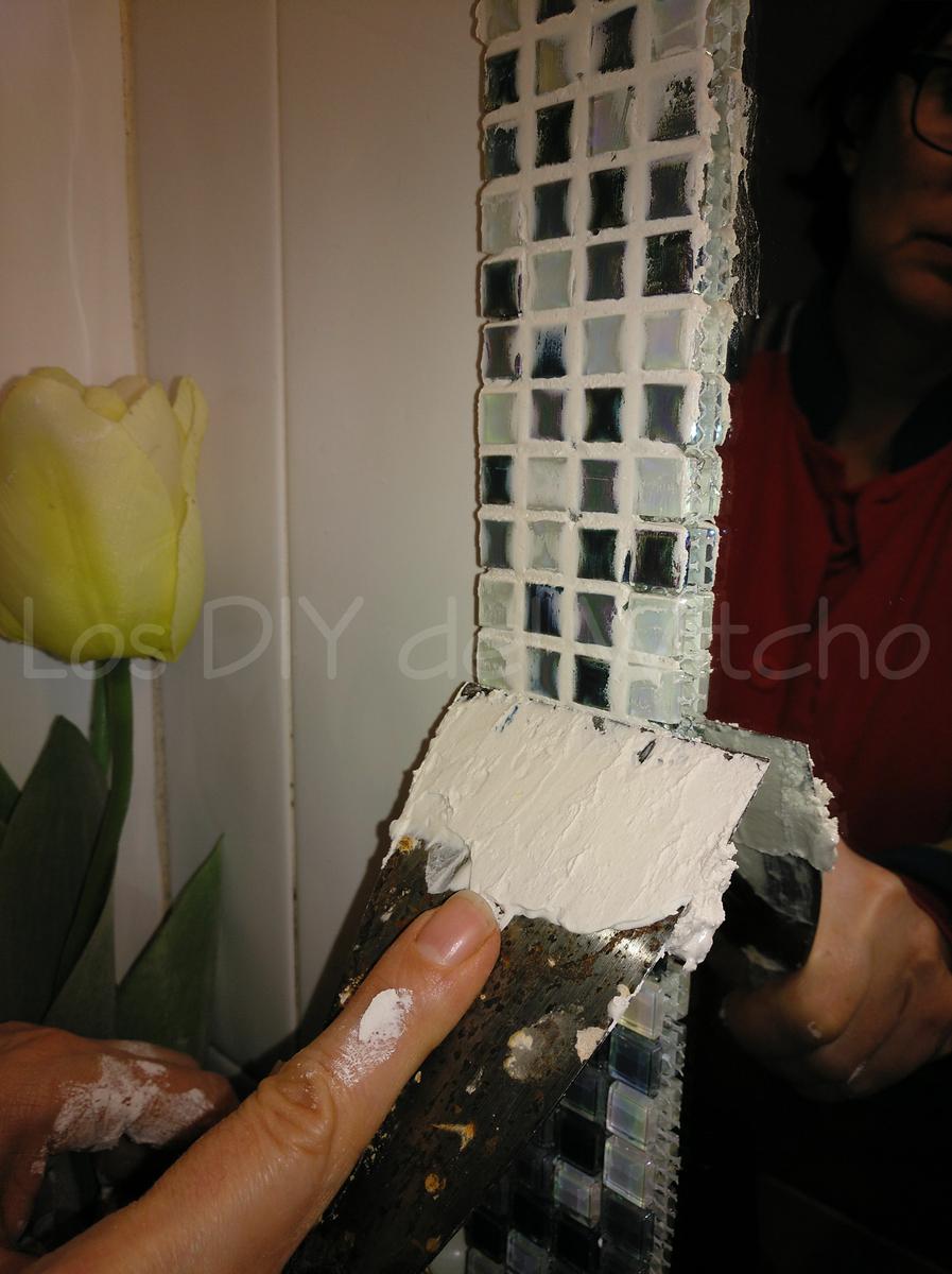 Una vez tenemos las tiras de gresite bien pegadas al espejo y secas prepararemos la lechada, que en algunos sitios también se llama boquilla.Para hacer la lechada o boquilla utilizaremos cemento blanco expreso para este trabajo, al que iremos añadiendo agua hasta obtener la consistencia de una natilla.