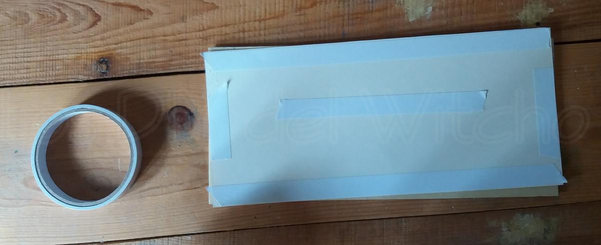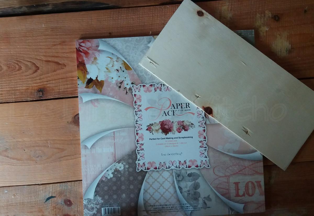 Recortamos el papel a la medida de la madera y colocamos la cinta de doble cara, aplicando varias tiras tanto en los bordes como en el centro. Después pegaremos el papel colocándolo primero desde el borde hacia el centro y los extremos, pasando la mano o un paño para evitar burbujas.