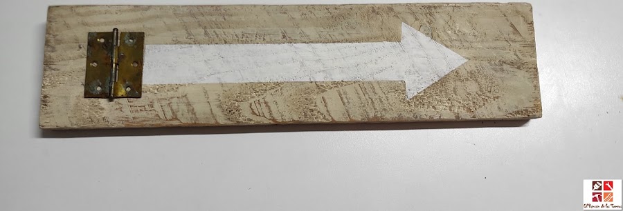 Para hacer la flecha he utilizado una tabla de madera que ya tenía preparada pintada con una mano de lasur primero y con pintura a la tiza color blanco después.