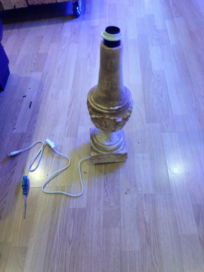 Pasado el rato me puse a hacer los agujeros en el centro para poder introducir el cable. Aproveché la tulipa y la pantalla de una lámpara vieja que tenia por el trastero y las monté con un poco de epoxi. Después conecte los cables a un conmutador para poder apagarla o encenderla y al enchufe, además añadí unas gomas en la base para que no rayara la mesa.