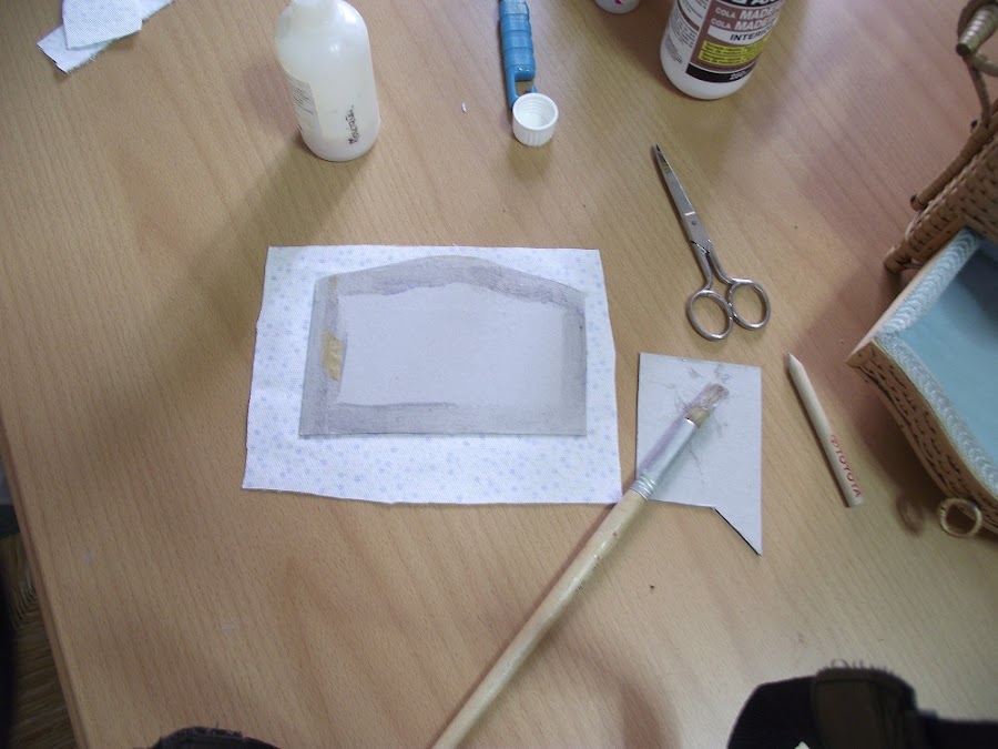 Para no estropear el recubrimiento de raso lo que hice fueron dos plantillas de cartón con las formas de la base y el cajoncito. La plantilla del cajón la forré con un piqué de florecinas azules que combina muy bien con el color del raso y que previsamente había endurecido tal y como os expliqué en este tutorial, para trabajar mejor y que no se ladee o se deshilache.
