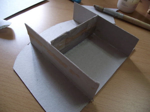 Encima de la base para el costurero monté una estructura en H con el mismo cartón (cartón especial para trabajos de cartonaje), uniendo los laterales a la base y entre sí mediante cola y cinta de carrocero.