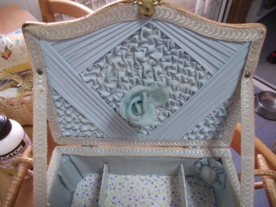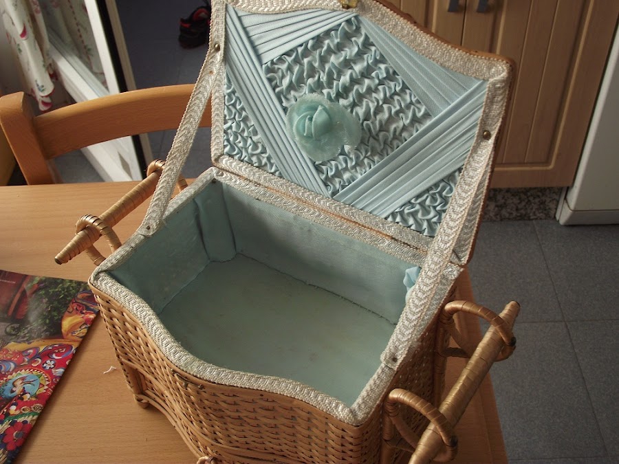 El costurero que he transformado hoy es uno de los trastos que me encantaban de la casa de mis abuelos. Es de y está forrado en raso color azul celeste. Además tiene un cajoncito en la parte de abajo, una rosa de adorno y un prendedor en una de las esquinas: no le falta detalle para ser un objeto precioso y llamativo.