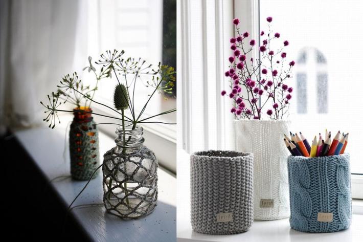 Esta idea proviene de los países nórdicos y se trata de“abrigar” los botes con una funda de ganchillo o de media, ya sea hecha con una manga de un antiguo jersey, o hecho a medida.