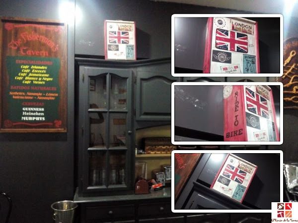 Una de las noches que estábamos cenando allí, me llamó la atención dos cajas de vino decorando así tal cual, en la parte de arriba de la alacena y le pregunté al dueño si las iba a tirar o qué iba a hacer con ellas, no es que tenga mucha confianza con él pero bueno me atreví y me dijo que no, que las tenía de adorno, entonces le dije, que si algún día las iba a tirar se acordara de mí y me guardara alguna , que yo pintaba y hacía trabajos de manualidades y que precisamente de estas cajas suelo tunear.