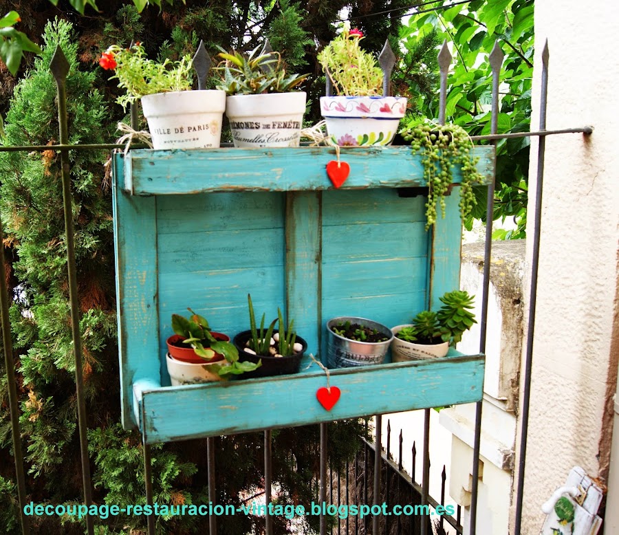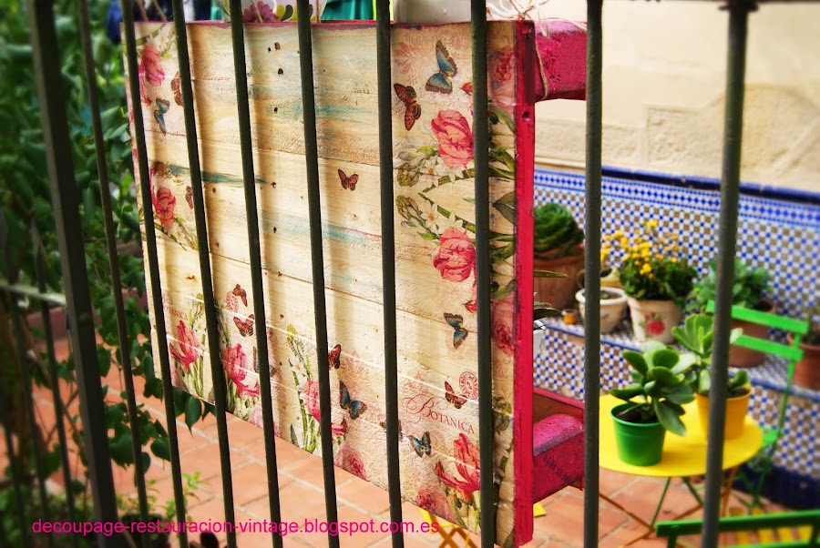 En mi caso no van pegados a la pared, sinó que van colgados en una valla que da a la calle, y para que no se viera la madera lo que se me ocurrió fue decorar la parte de detrás con decoupage. Os enseño las fotos de como queda desde el patio y desde la calle.