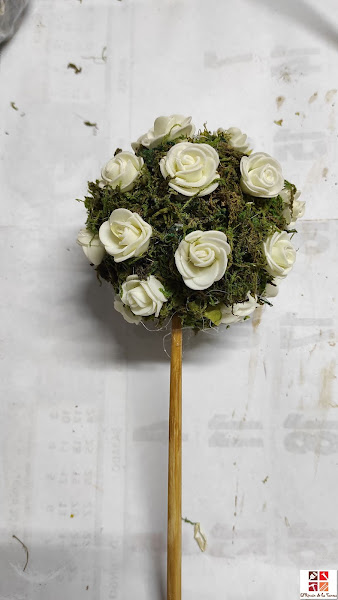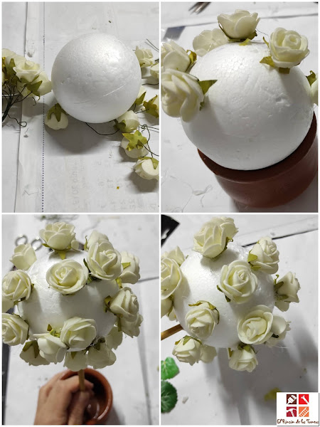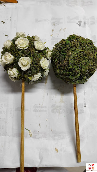 He hecho lo mismo pero alternando musgo y unas pequeñas rosas blancas que tenía guardadas y que he quitado los tallos para poder pegarlas con la pistola de silicona caliente.