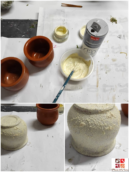Los he pintado con pintura a la tiza mezclada con bicarbonato para que el efecto fuese con grumos.Una mano de barniz y una cuerda de sisal alrededor para decorar.