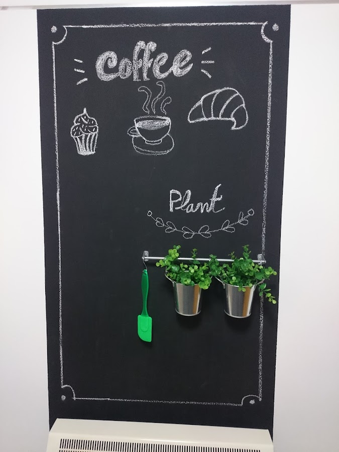 Yo personalicé la pared de mi cocina que era bastante sosa y el resultado quedó una decoración muy fresca y chic, con un aire muy actual, estaba cansada de ver la pared tan blanca, que pensé que con esta idea podría quedarle genial, además de que necesitaba un sitio para anotar....cositas. por ejemplo la lista de la compra, dejar notas, frases bonitas que me gusta ver, mensajes bonitos a la family e incluso cambiar la decoración, simplemente cambiando de dibujo con unas simples tizas, me sorprendió bastante el resultado, ya que esa pared es ahora la protagonista de la cocina.