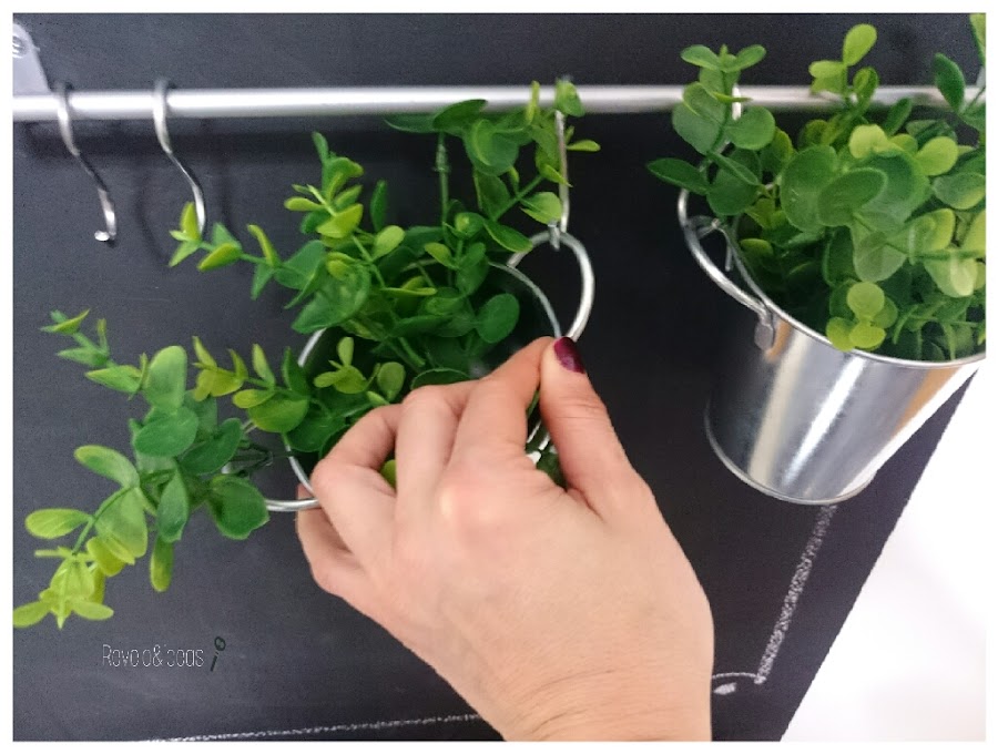 Y sobre los ganchos, colgaremos las macetitas con las plantitas, yo en mi caso me decidí por plantas artificiales para la decoración, pero también quedarán genial unas plantitas aromáticas naturales.