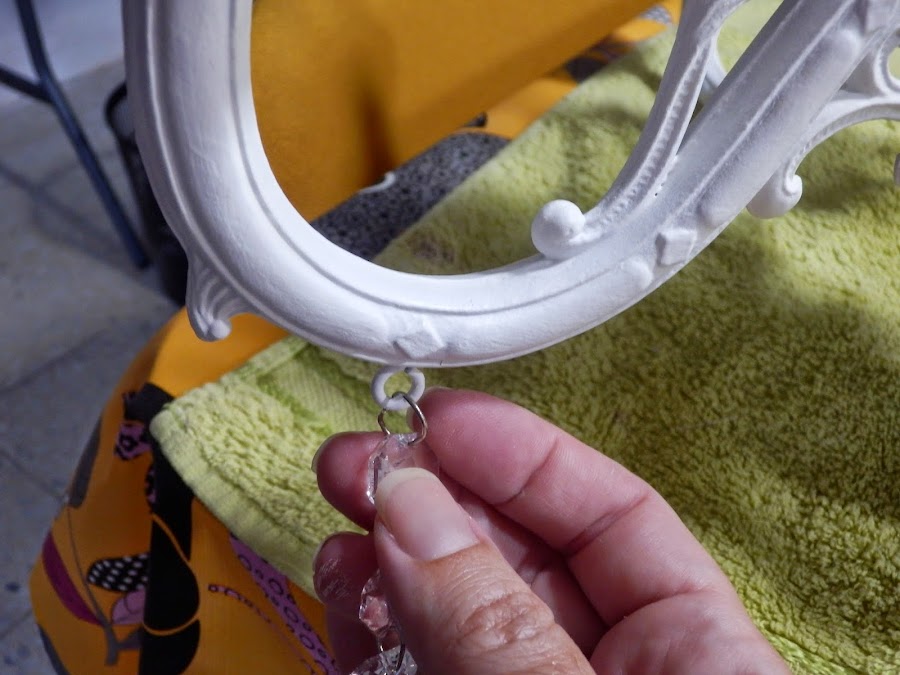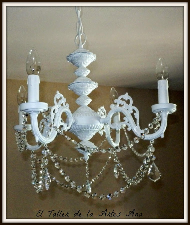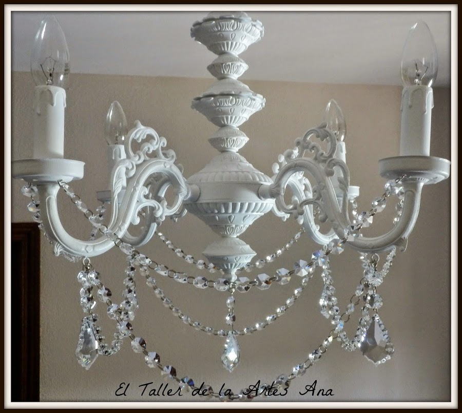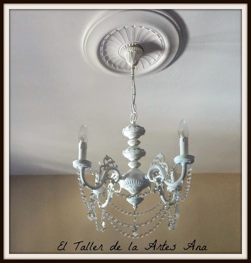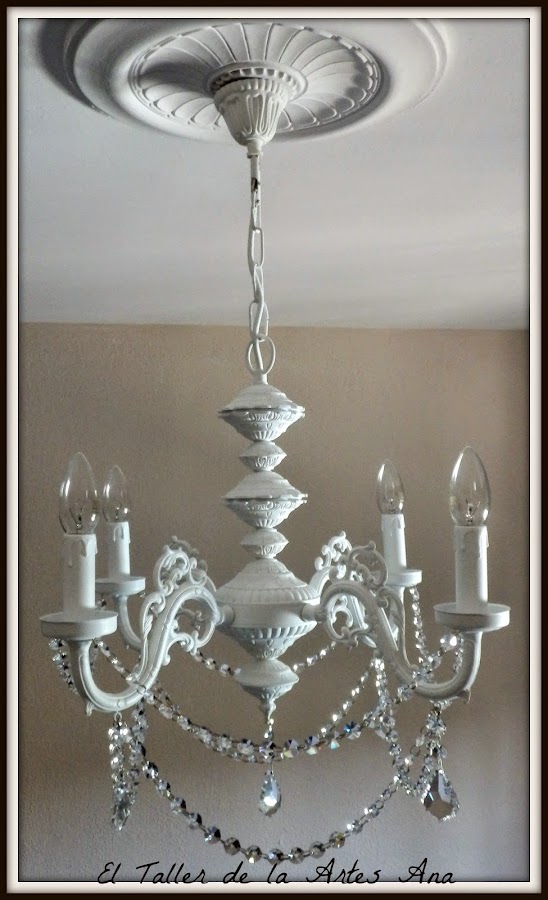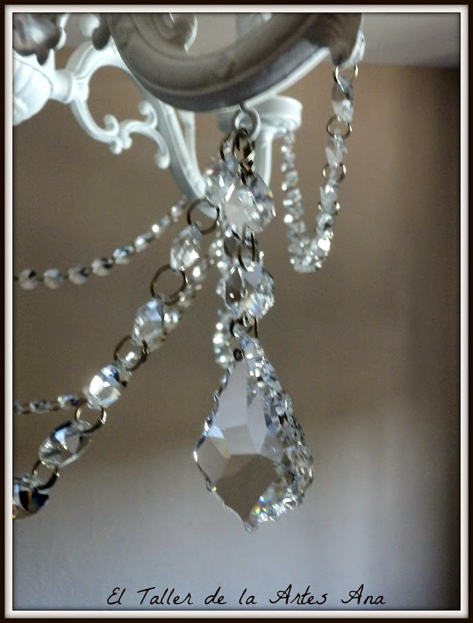 Después de proteger toda la lámpara con barniz mate en spray tocaba la parte más divertida, colocar los caireles a mi gusto. Unas tiras largas y las lágrimas preciosas.