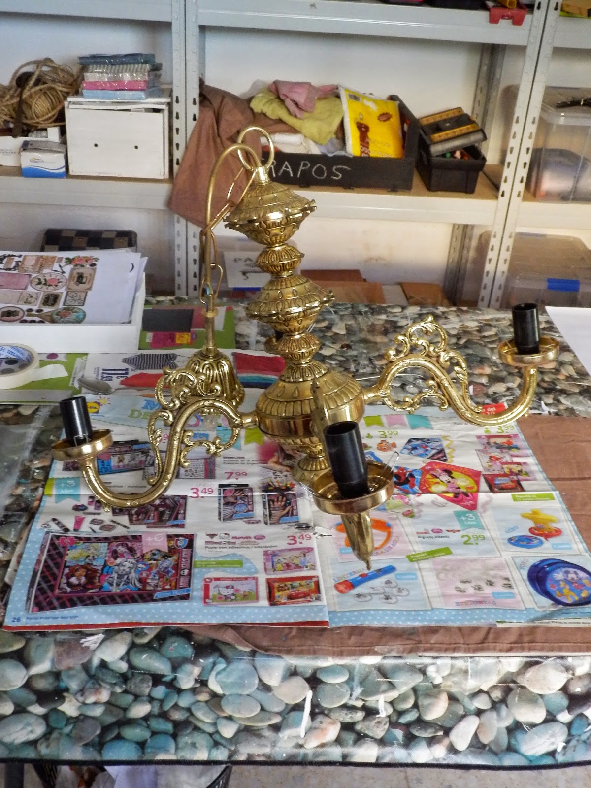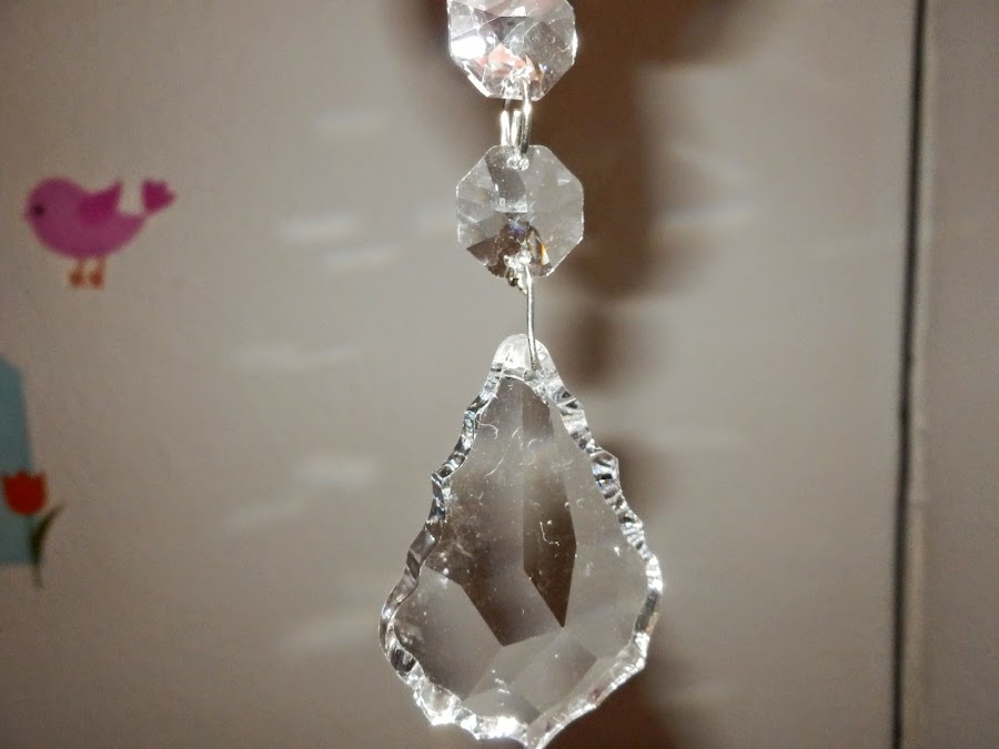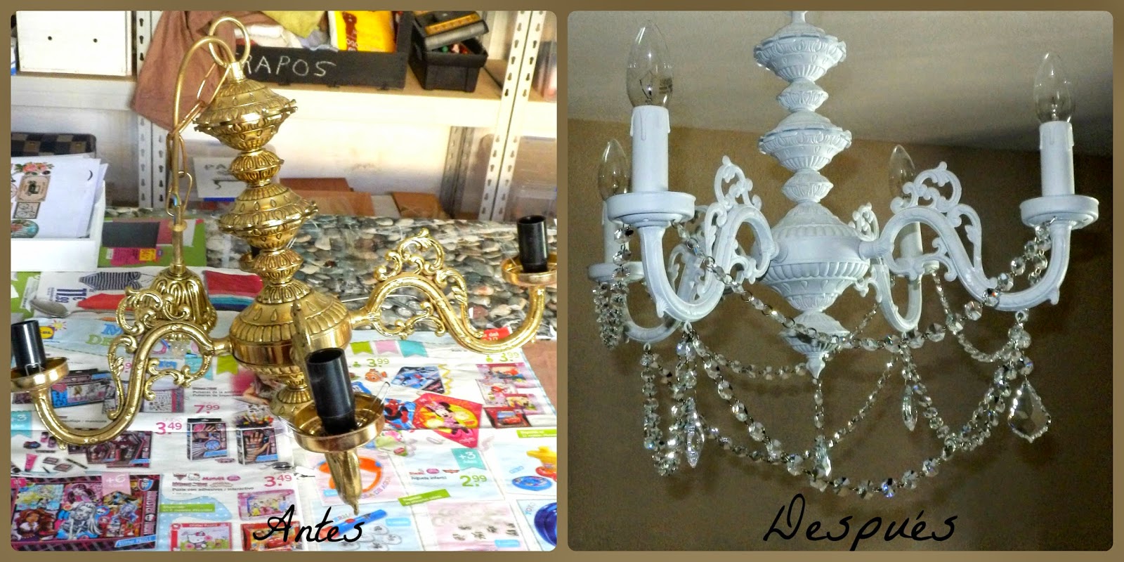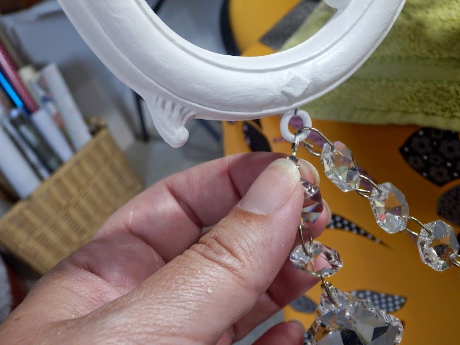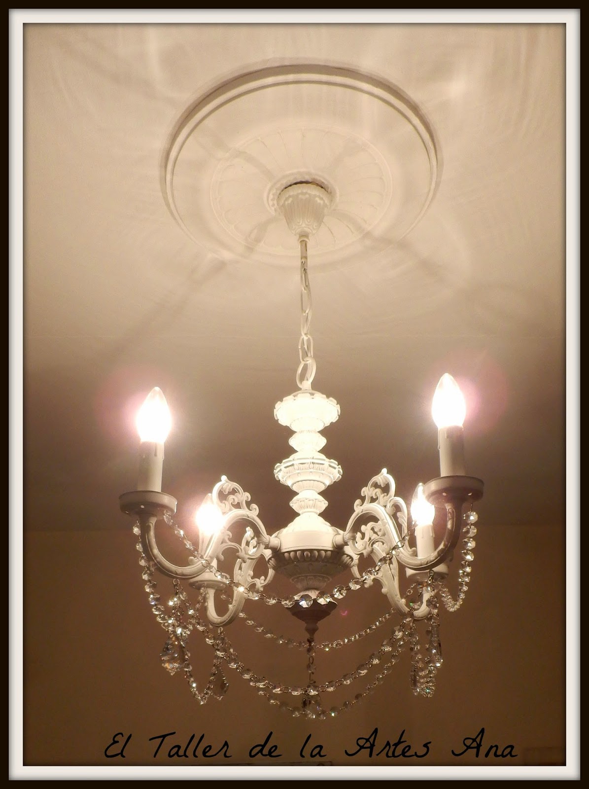 Después de proteger toda la lámpara con barniz mate en spray tocaba la parte más divertida, colocar los caireles a mi gusto. Unas tiras largas y las lágrimas preciosas.