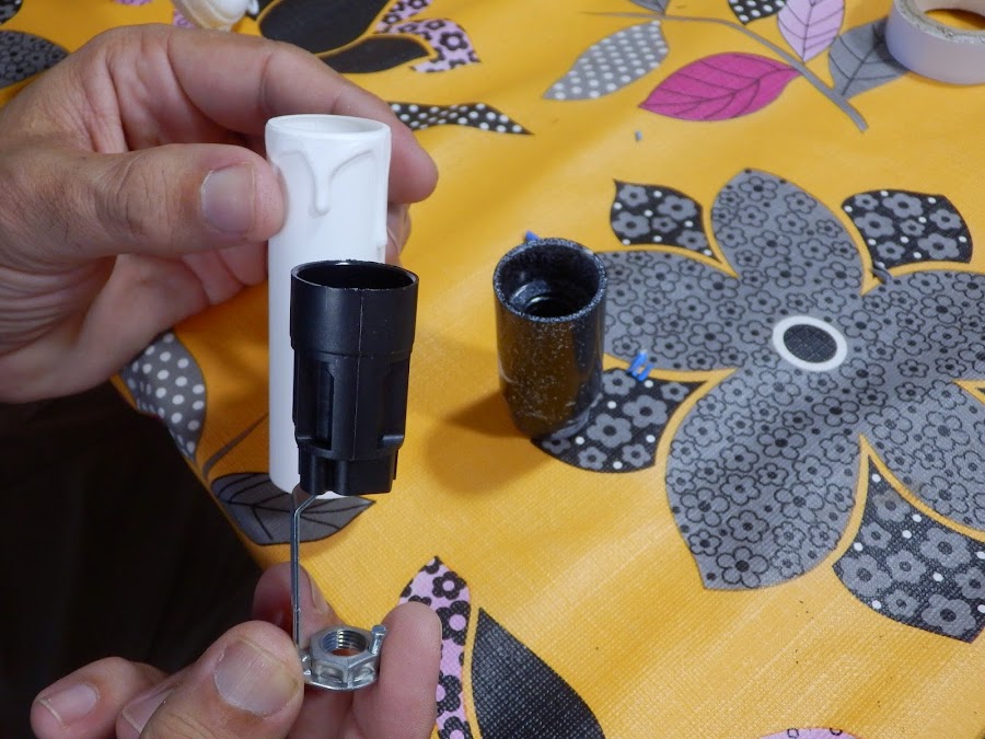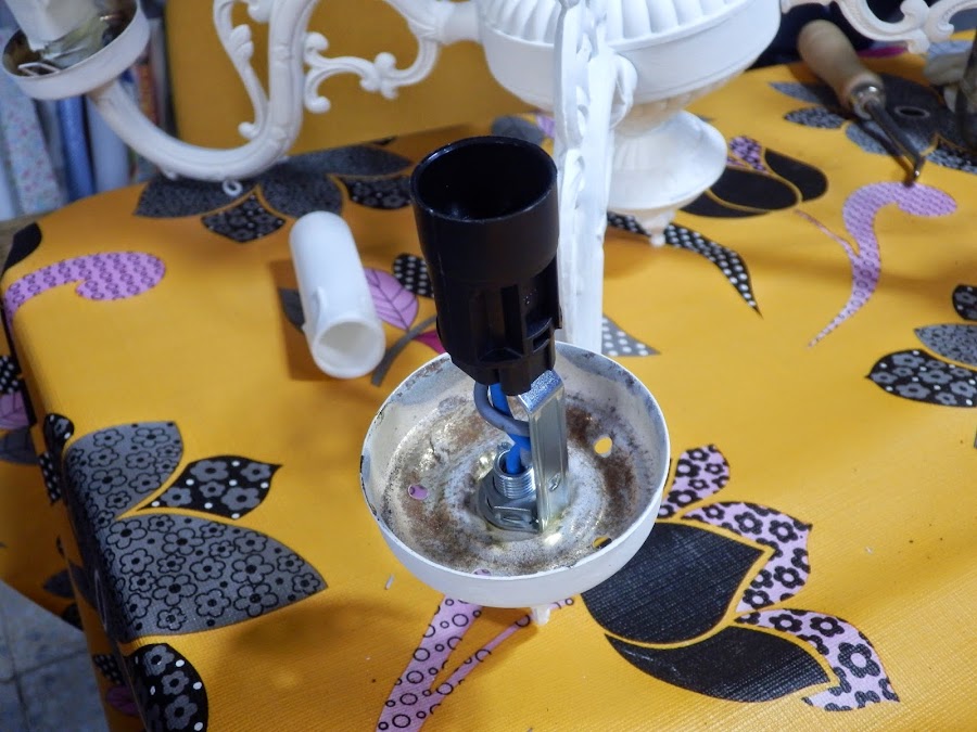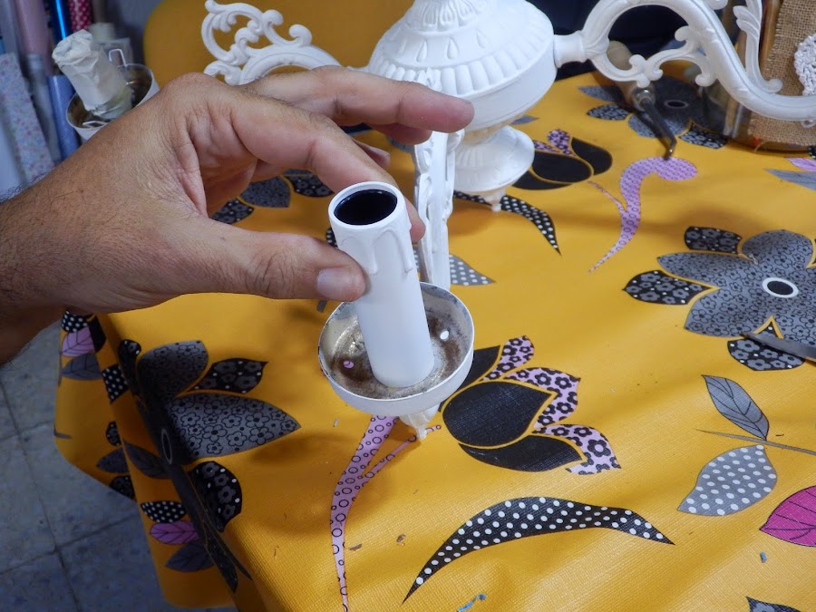 En las ferreterías venden un sistema de casquillos para insertar posteriormente la vela. Elegí esta forma de poner las bombillas ya que no quería ningún tipo de tulipas ni de cristal, como supongo que tenía la lámpara originalmente, ni de tela.