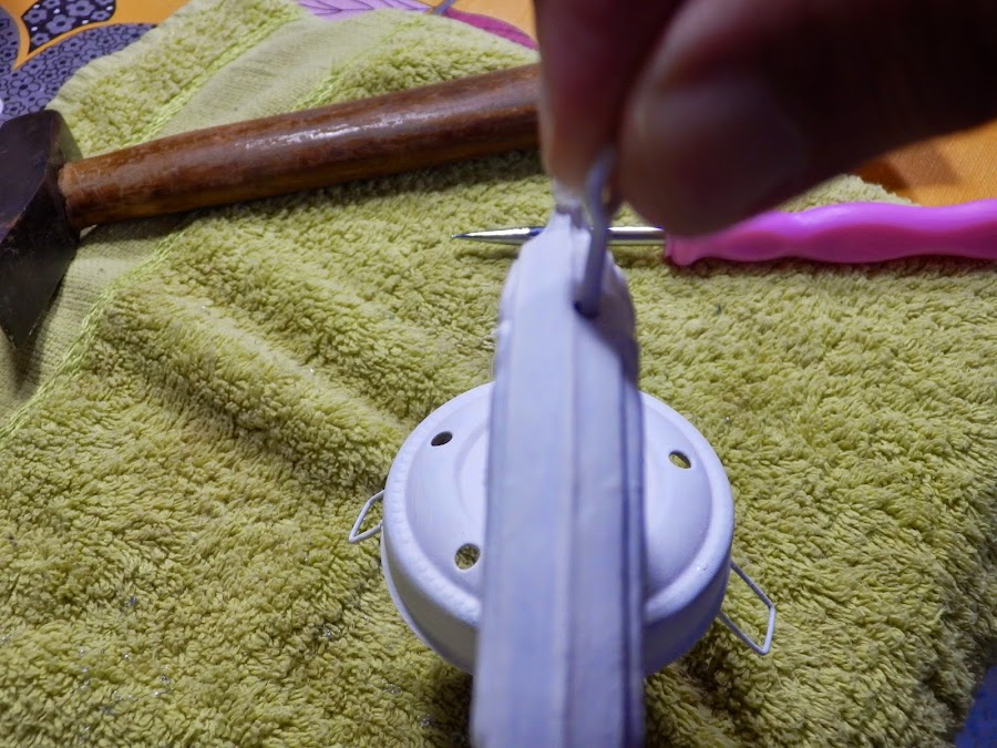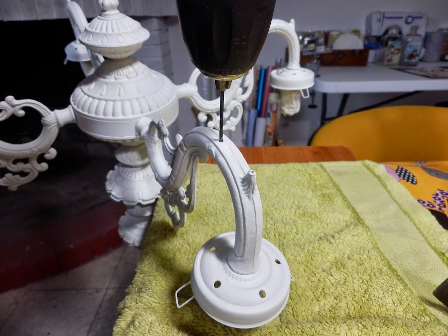 Como esta lámpara no tenía agujeritos para colgar los caireles se los tuvimos que hacer con una broca muy fina para metales.