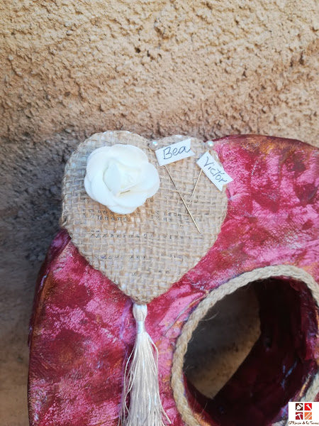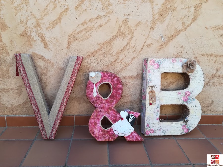 Hoy tercer lunes de mes toca reto de Ana del blog Diy de todo un poco y el tema elegido por Esther, del blog Flor de Diys y merecida ganadora del reto de las latas es: encajes, sí , si...encaje, creo que al principio me quedé un poco así como ....y que hago yo con encajes? pero luego me dí cuenta que muchos de los diys que hago tienen como decoración una parte de encaje, bien sea con tela de rafia o de otra manera así es que este ultimo encargo que me han hecho me ha venido como anillo al dedo..y hablando de anillos....el encargo es para una boda, me pidieron que hiciera unas letras para este puente del Pilar para una parejita: Victor y Bea, ya que se casaban en mi pueblo, en la @Iglesia de Santa María de Villafáfila, y como tenía pensado ir en estas fechas me puse con ellas en cuanto me lo dijeron. Ahhh, un requisito que me dijeron es que llevasen algo en tono burdeos