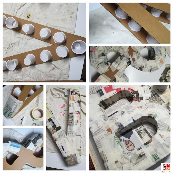 Pegar vasos de plástico alternándolos como en la foto, pegar la otra parte de la letra y unir con trozos de recortes de papel de periódico pegando con cinta de carrocero, y así con todas las letras y hasta conseguir envolverlas todas para dar más consistencia.