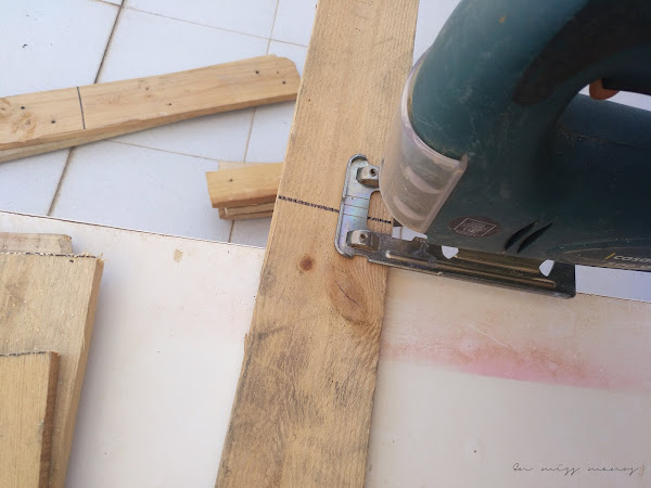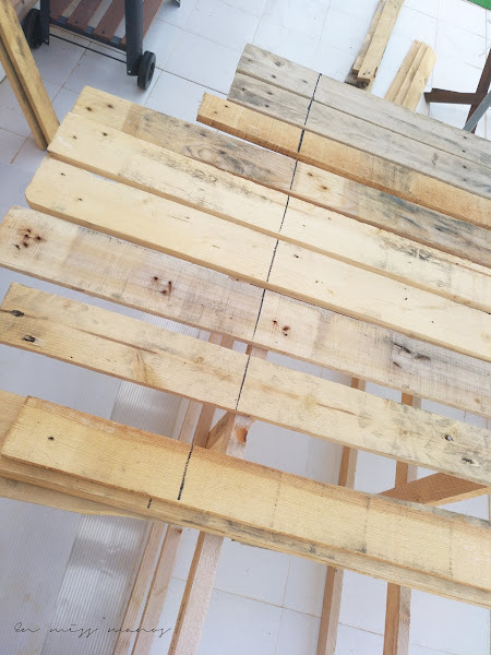 Con todas las maderas de palets desmontados que tenía en casa, para hacer las supuestas jardineras, las fui colocando en la base superior y marqué la medida para cortarlas con la caladora.