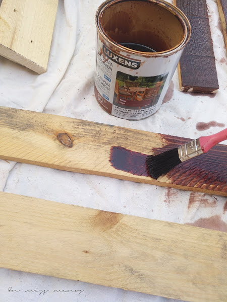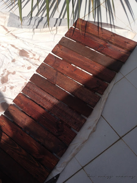Una vez todas cortadas, las teñí con aceite de teca, como el resto de muebles de la terraza.