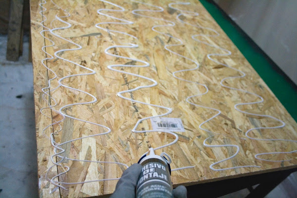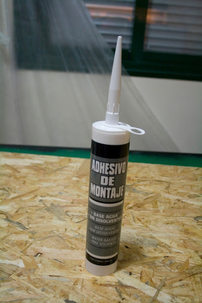 8. Aplicamos la cola de montaje sobre la tabla de madera haciendo eses. Asegurándonos de que hemos cubierto bien toda la base.