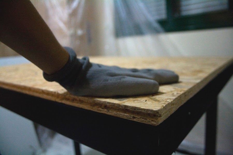 6. Cortamos el panel de madera a la medida de la superficie de la mesa.