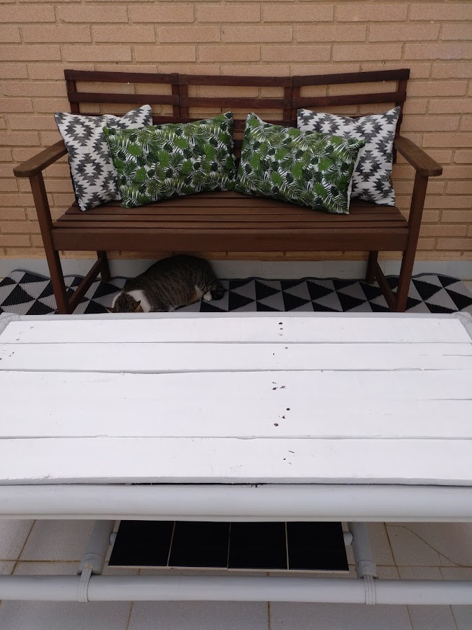 A parte de la mesa, también hice los cojines para el banco de detrás, pero no enseño el paso a paso detallado porque ya he subido varias fundas de cojín al blog y es más de lo mismo, ¡además de súper fácil!