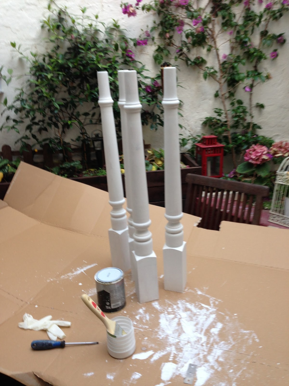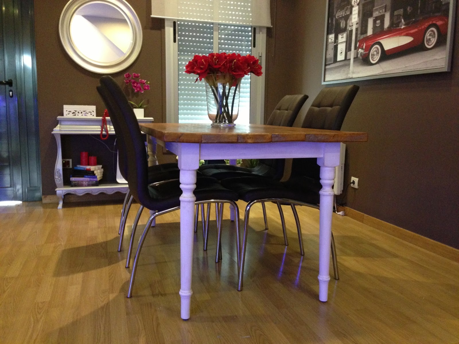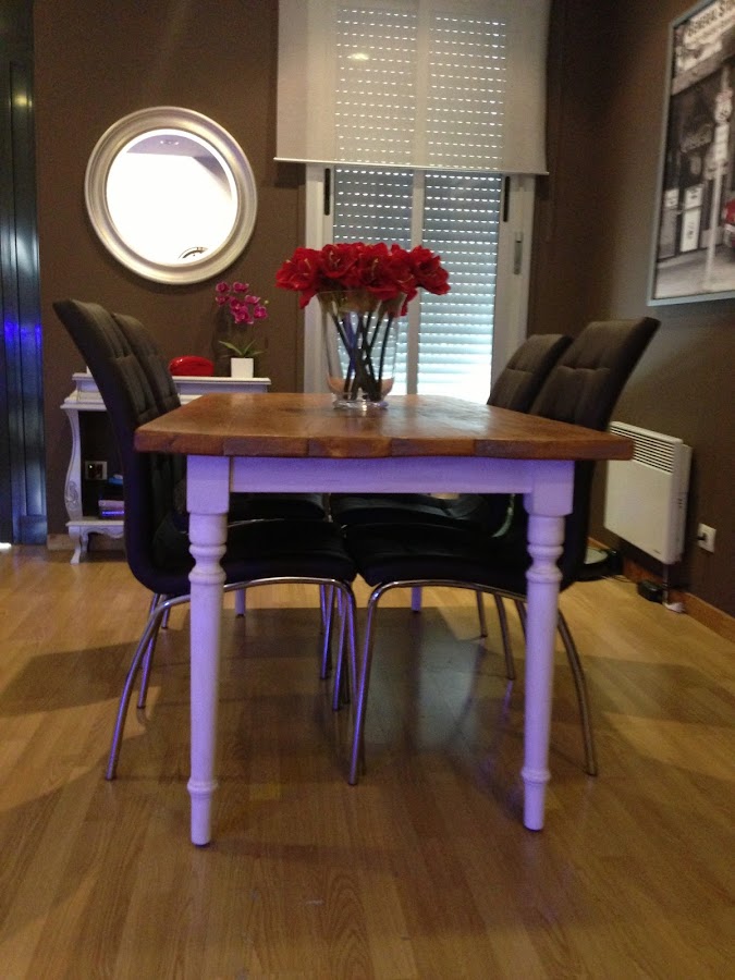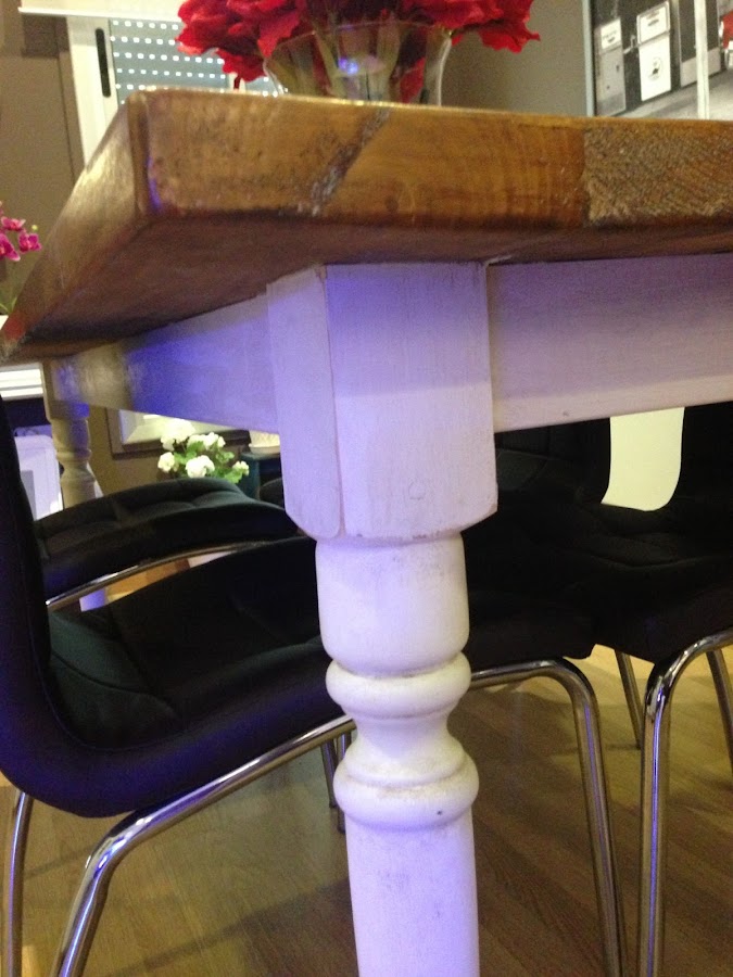 Después del sobre llegó la hora de la parte inferior. Las patas están pintadas de blanco, un poco decapadas con lija y enceradas con cera y betún para darle un toque antiguo que combine con las otras piezas de la casa. Después le tocó el turno a los bastidores que unen las patas para darle a la mesa la robustez y diseño definitivo.