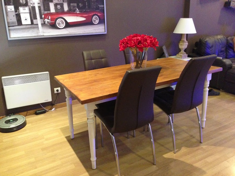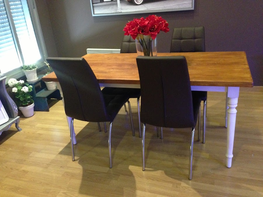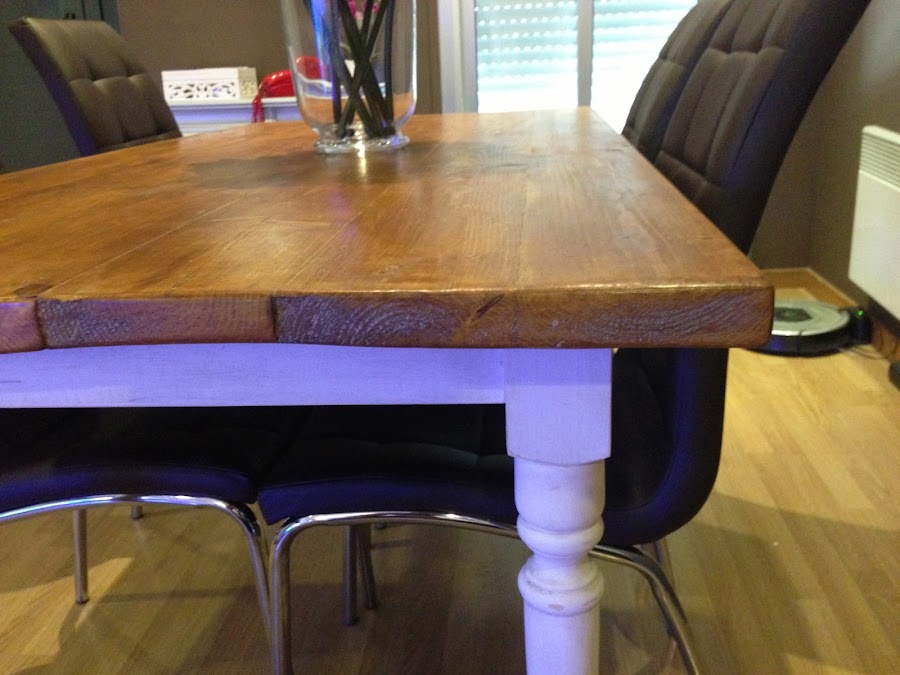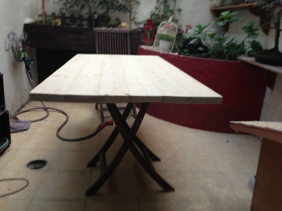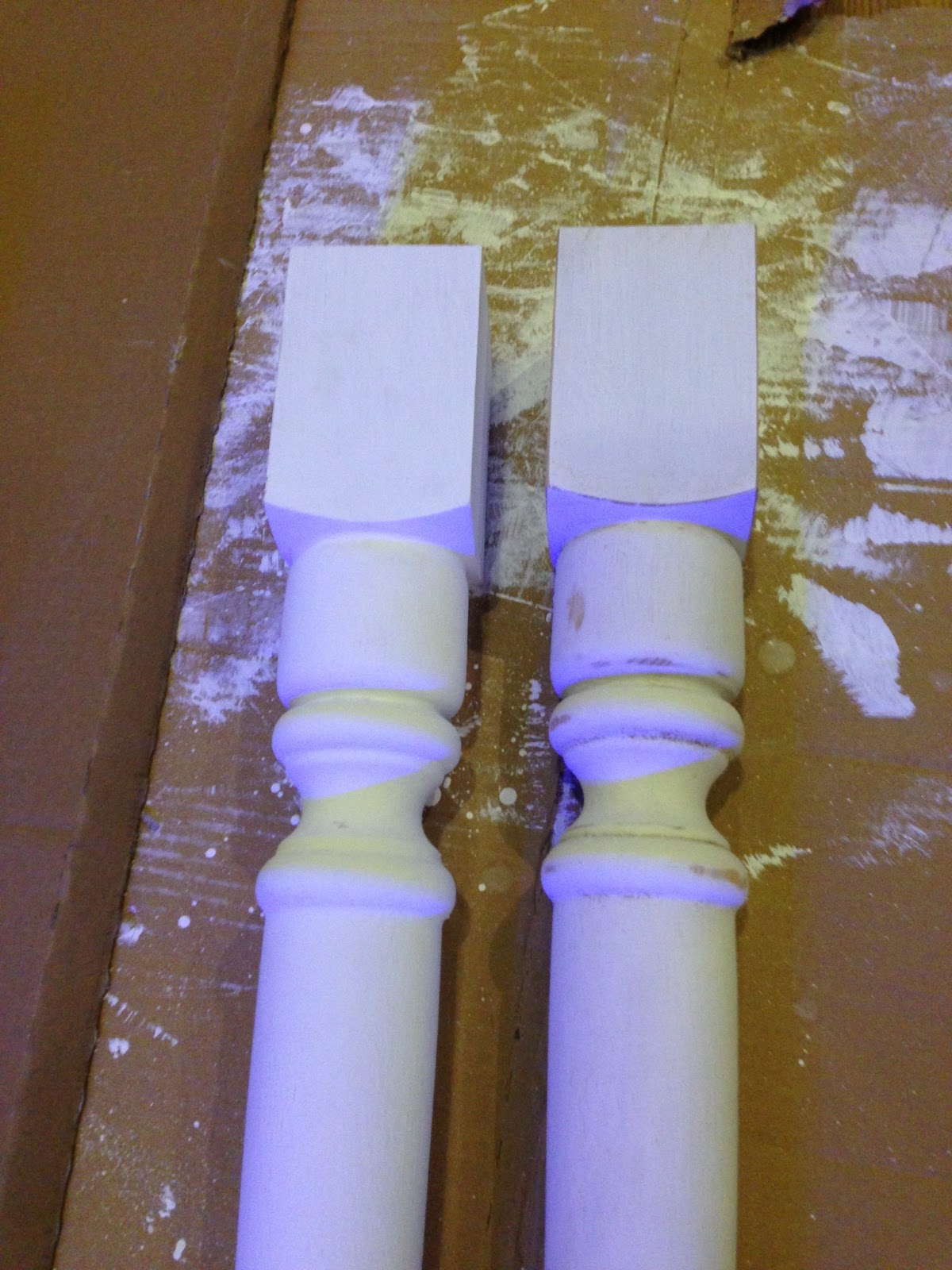 Después del sobre llegó la hora de la parte inferior. Las patas están pintadas de blanco, un poco decapadas con lija y enceradas con cera y betún para darle un toque antiguo que combine con las otras piezas de la casa. Después le tocó el turno a los bastidores que unen las patas para darle a la mesa la robustez y diseño definitivo.