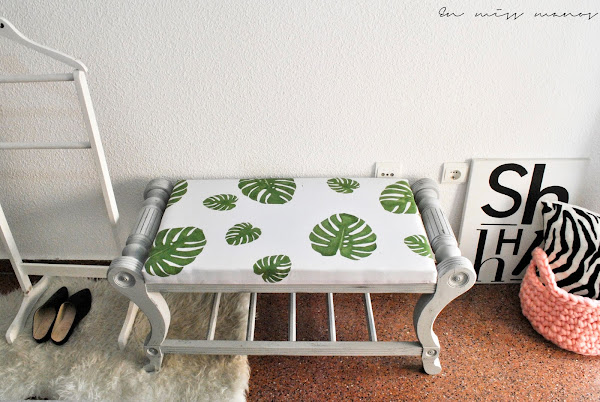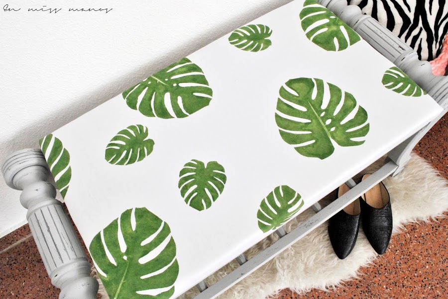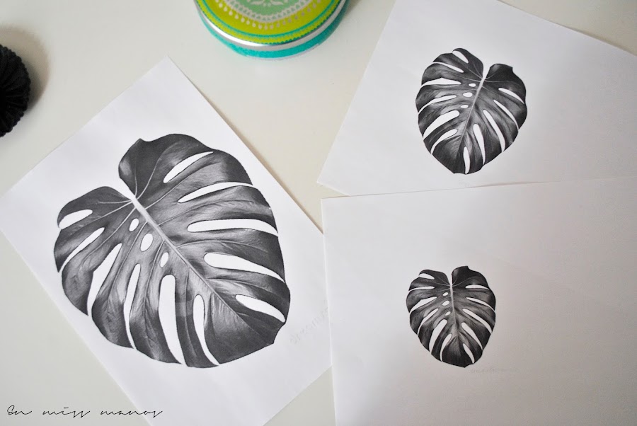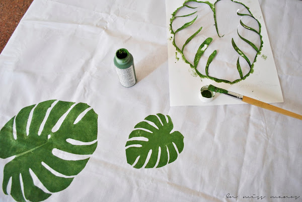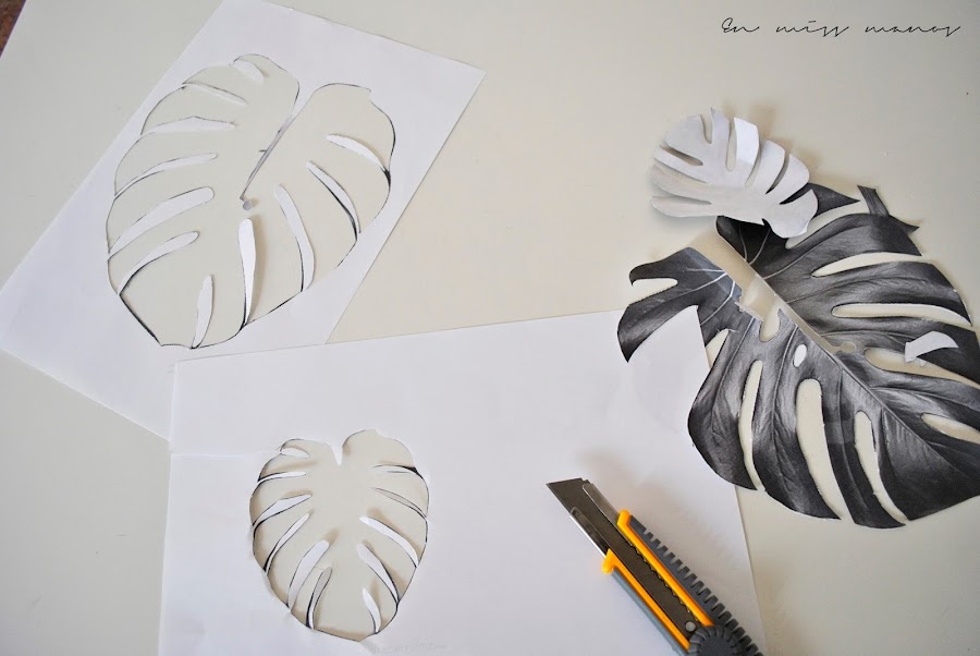 Como ahora está la moda de los estampados tropicales y me encanta, a pesar de seguir en invierno, me arriesgué a hacerle un estampado a una tela blanca que tenía en casa, y darle vidilla para el verano. Elegí unas hojas de monstera, que imprimí y recorté para usarlas de plantilla.