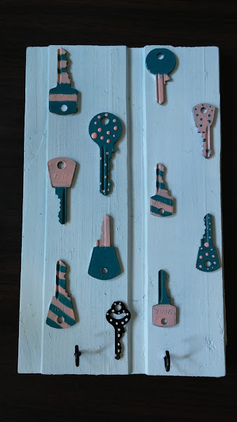 Pegamos todas las llaves pintadas previamente con pegamento en nuestra madera, le agregamos 2 arandelas para colgar las llaves y listo!!