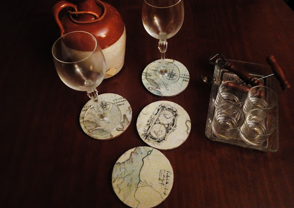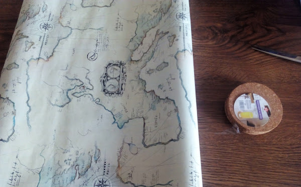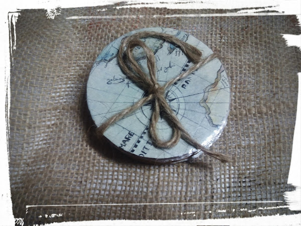 He utilizado para esta manualidad unos discos de corcho (comprados en los hiper asiáticos) y un papel tipo regalo que tengo de mapas y que todavía no había utilizado en nada.