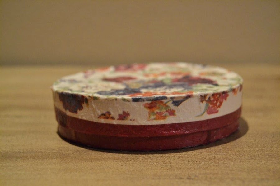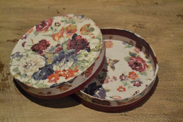 Y con una caja de madera (bueno, madera, símil) donde va el queso camembert, también la hemos tuneado, y forrándola también con servilletas de papel, la hemos transformado en una útil caja para guardar gomas del cabello, pasadores, etc...