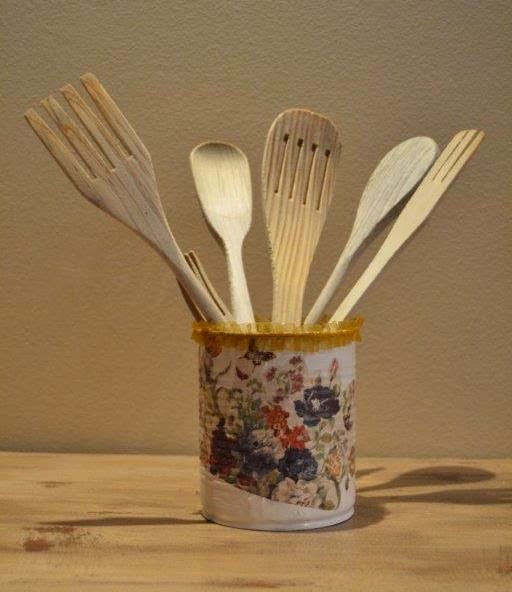 Pues bien, con las típicas latas de tomate de medio kilo, las que utilizamos casi a diario, hemos tuneado una de ellas y la hemos transformado en un bote para los cubiertos de madera de la cocina.