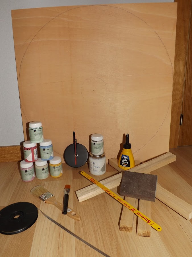 Dibujamos una circunferencia en el ocumen y la cortamos. Una vez tengamos el círculo, con ayuda del metro, la escuadra, la regla y el lápiz dividimos la circunferencia en 12 partes iguales y dibujamos un segundo círculo en el centro del tamaño del reloj.