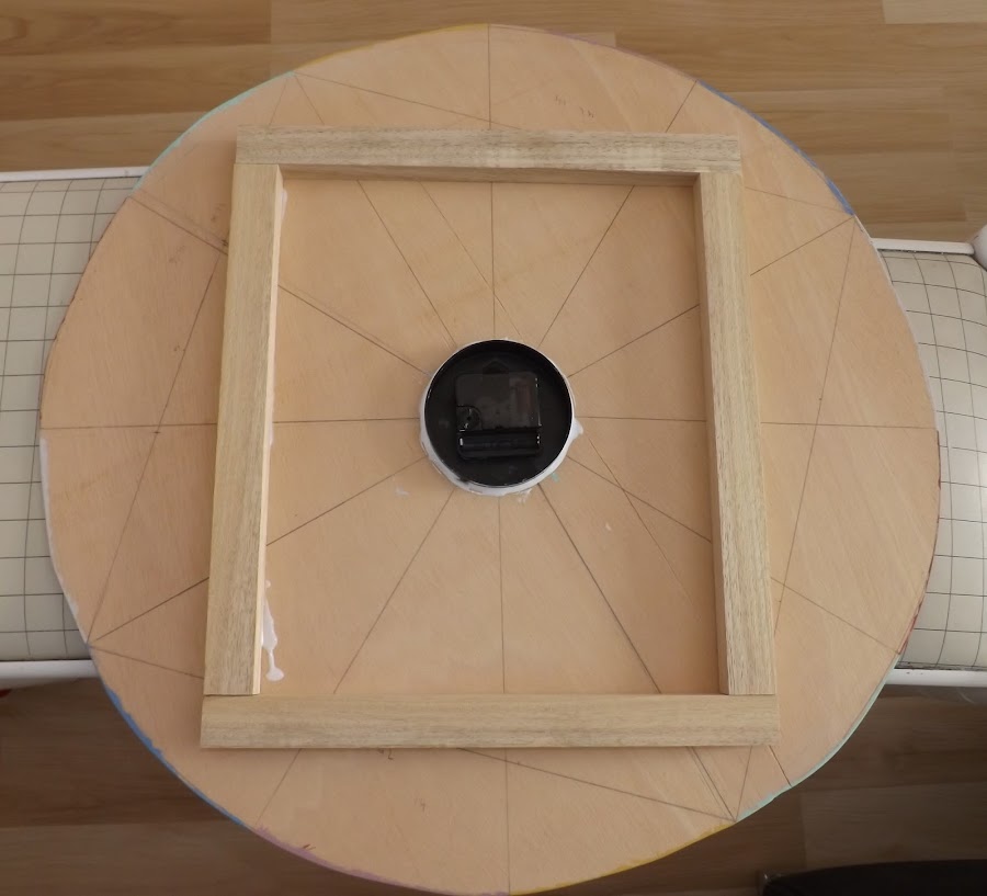 A continuación, damos la vuelta al reloj para pegar los listones de madera, que cumplen una doble función: que el ocumen no se abombe y que el listón que queda en la parte de arriba sea donde coloquemos la hembrilla necesaria para colgarlo en la pared.