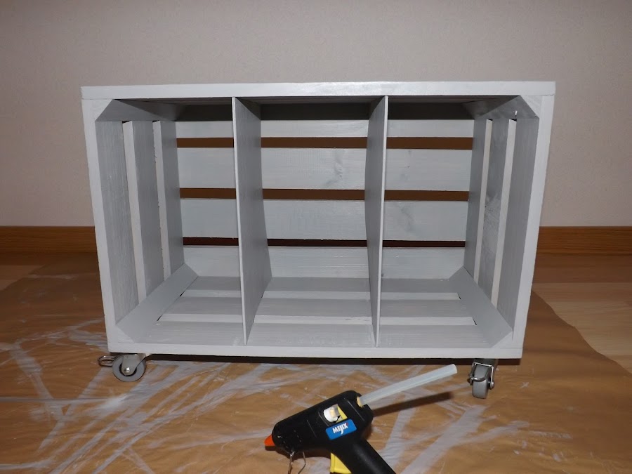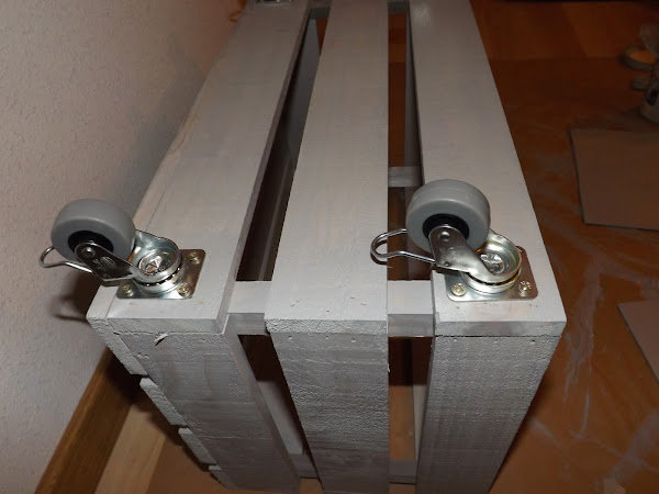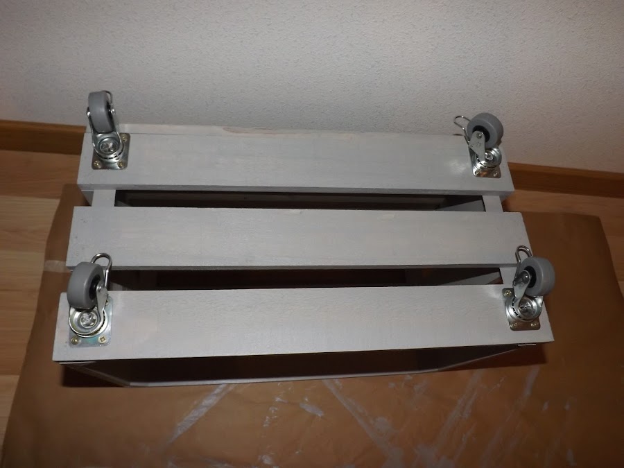 Cuando se haya secado todo, colocamos las ruedas en los extremos de la base de la caja con ayuda de un destornillador y unos tornillos.