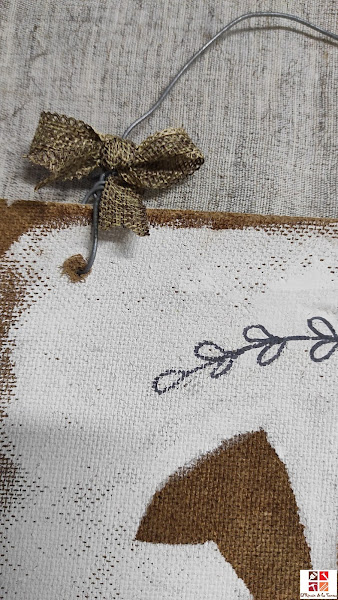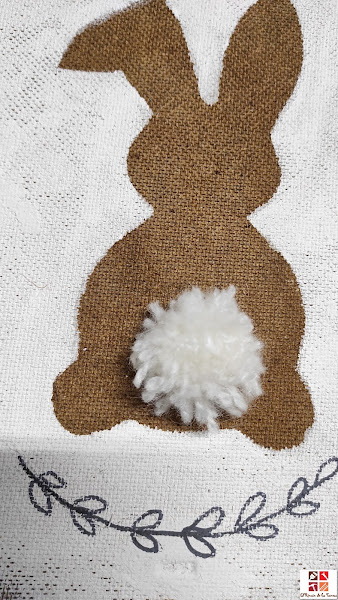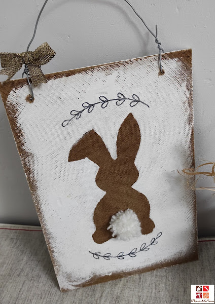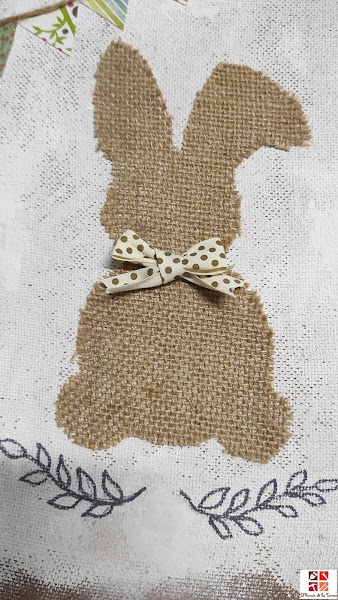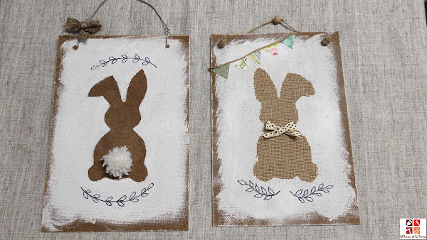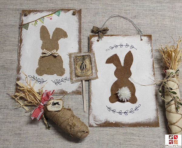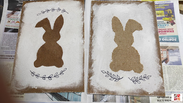 La siguiente tabla hice lo mismo pero esta vez, pegué la silueta del conejo a un trozo de tela de arpilleria, recorté y pegué en la tabla.