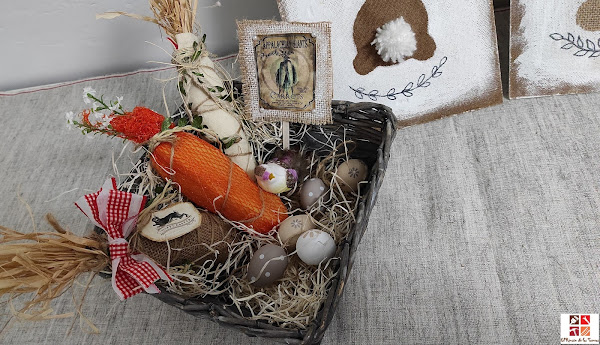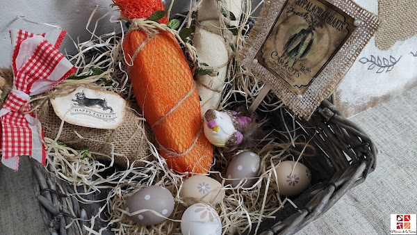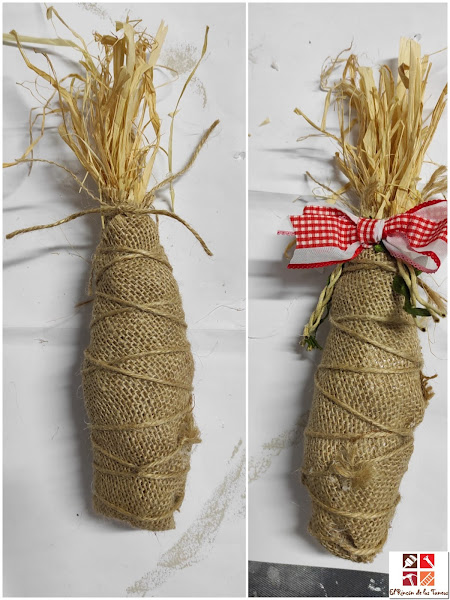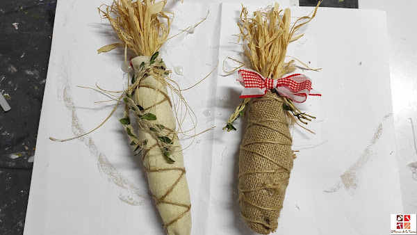 Como veis había acabado y estaba todo preparado para la composición final, pero al coger una cesta de las que tengo guardadas para decorar, encontré una bolsa con redes de las que vienen con los ajos y cebollas y me vino otra idea a la cabeza al ver una red de color naranja, no me pude resistir.... así que a por otra zanahoria (o similar)