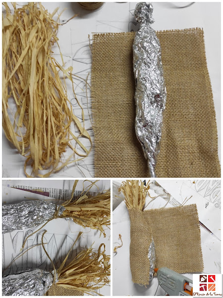 Para el ramaje he utilizado unas tiras tipo paja sujetándolas con cuerda de sisal