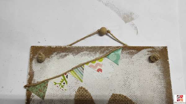 Para el otro cuadro lo he decorado con una guirnalda hecha con papel de scrapt y cuerda de sisal, pegado con cola