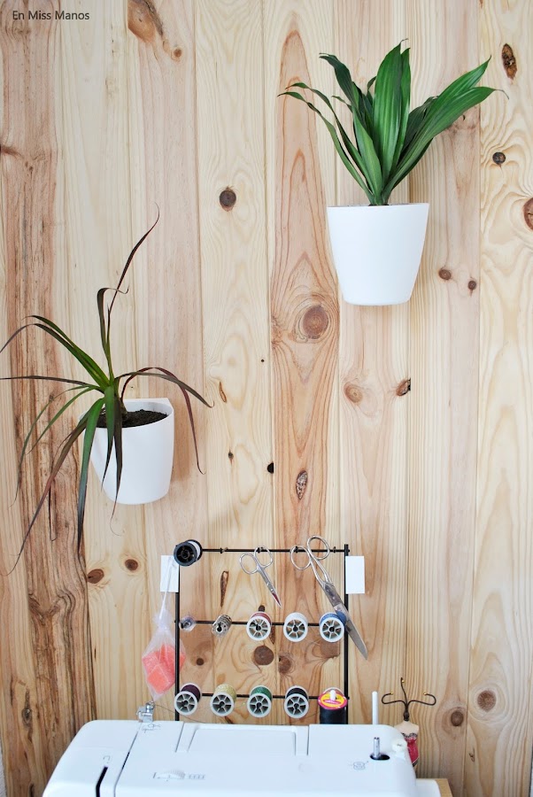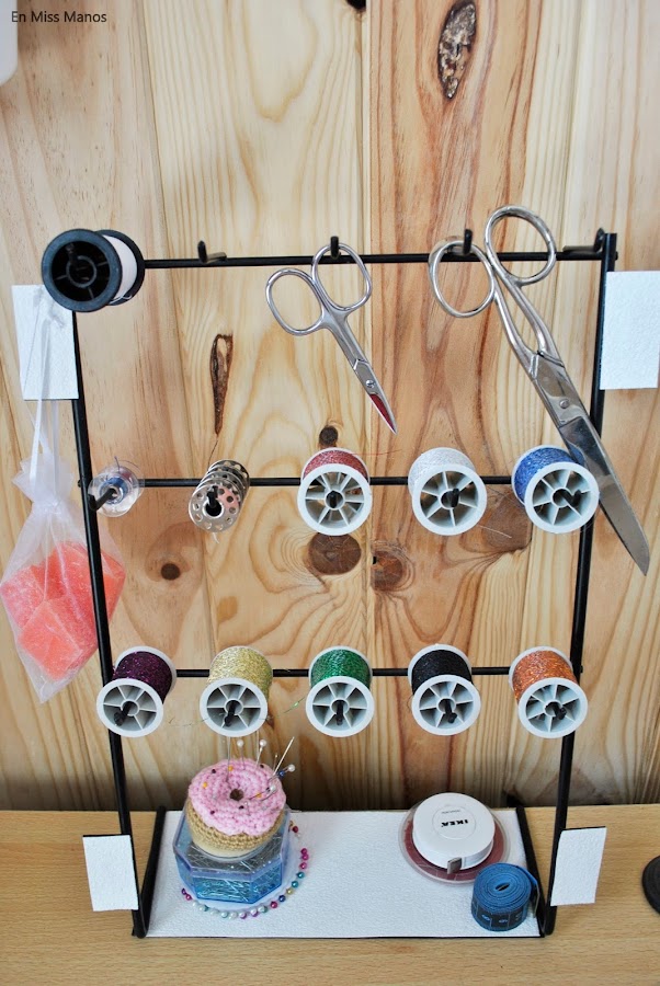 Lo único que hice para tapar las zonas feas del metal fue ponerle papel pintado para disimular, y listo!! Pensé en usarlo para ordenar los washi tapes, pero como ya los tenía ordenados en otro sitio decidí colocarlo en la mesita de la máquina de coser para colgar algunos hilos, canillas, tijeras...y tenerlo un pelín más ordenado todo.