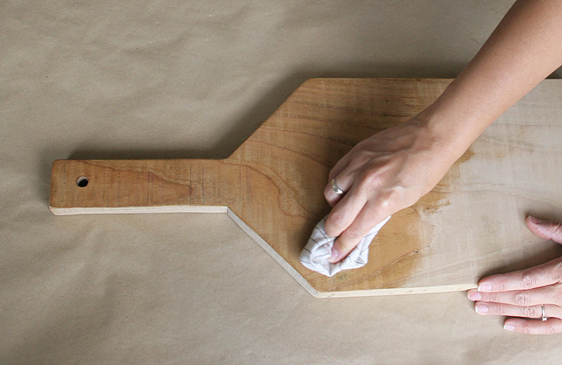 Cera para proteger la madera y un paño del algodón. Lo mejor es que sea una cera especial para cocinas si tenéis intención de usar la tabla para comida... Pero sino queréis comprar un producto tan específico, podéis usar aceite de oliva ;)