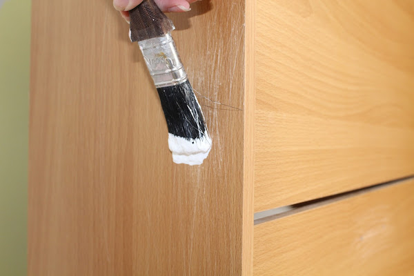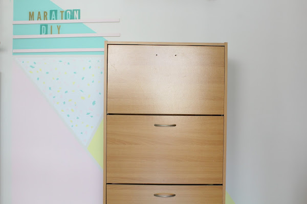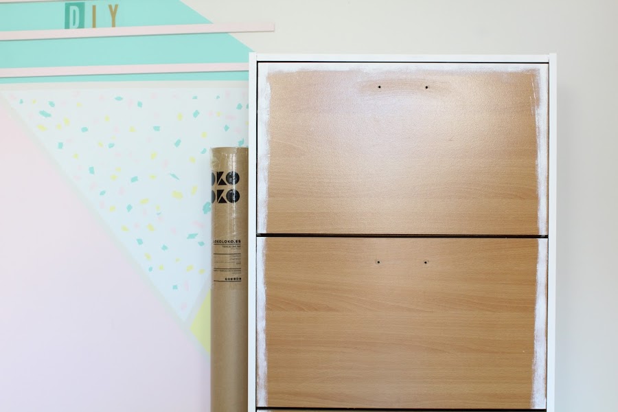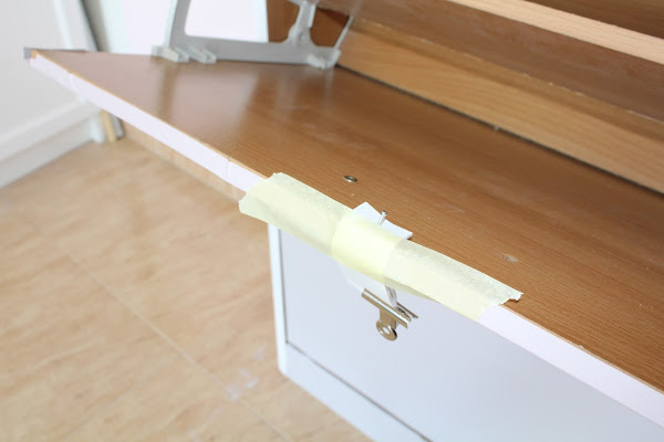 3 Paso: Una vez este seca la pintura mediremos el ancho del cajón y con un cuter cortaremos el trozo de vinilo que necesitamos. Una vez tengamos lista la tira de vinilo con ayuda de una tarjeta iremos pegando el vinilo (Mejor hacerlo entre dos, sera más fácil).
