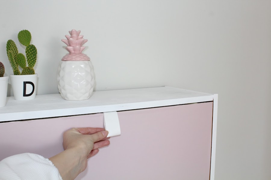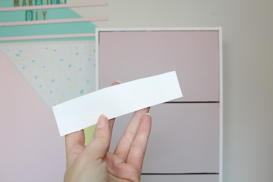 4 Paso: Crearemos unos tiradores con tela de polipiel, cortamos unas tiras y las doblamos por la mitad. Cogemos las puntas y las clavamos centradas en los cajones.