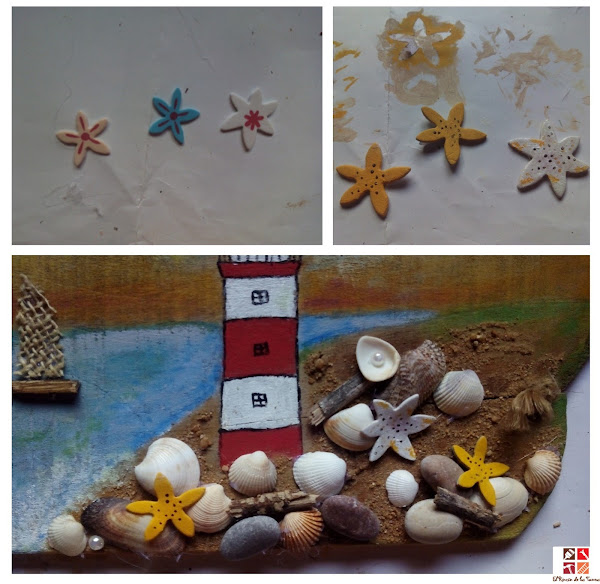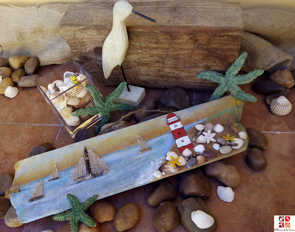 Después y con la pistola de silicona caliente he ido pegando conchas por acá, piedras por allá, trozos de madera, ...hasta crear un collage marinero.