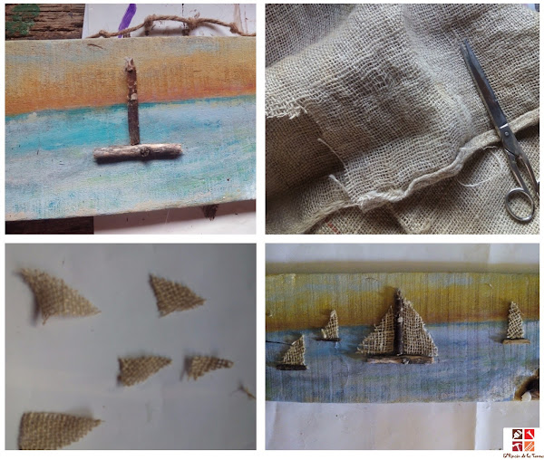 Ahora le toca el turno a los barquitos, trozos de palos, trozos de tela de saco para hacer las velas y todo pegado con la pistola de silicona caliente